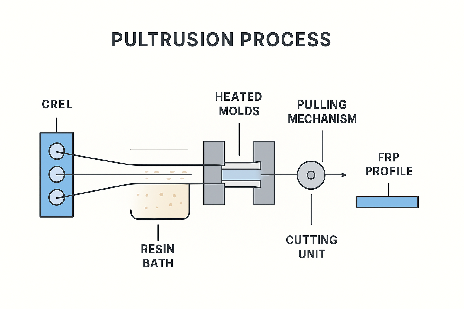 Pultrusion is a continuous process where fiberglass reinforcement is pulled through a resin bath and shaped in a heated die. This creates uniform FRP profiles with high strength-to-weight ratios.
